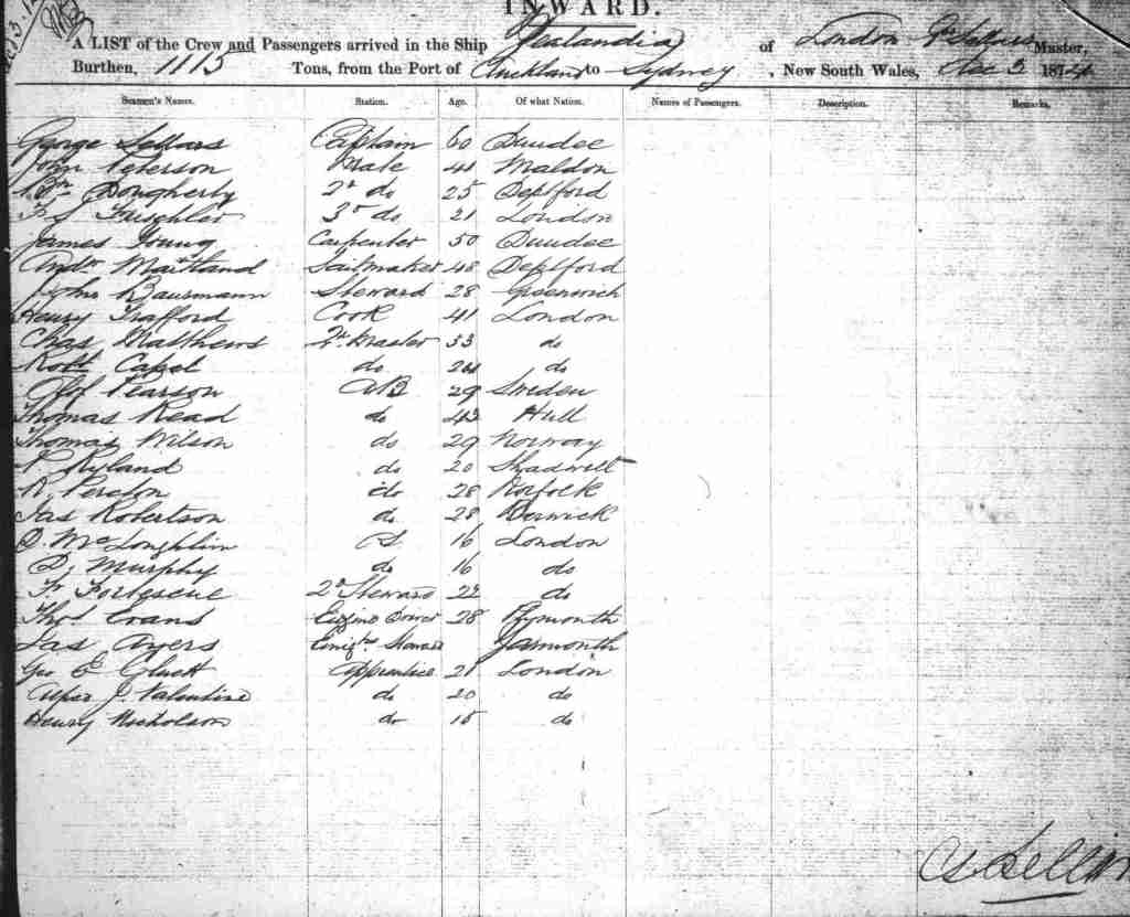 Departed Auckland, New Zealand for London via Sydney, arrived Sydney, Australia on the 3rd of December 1874.