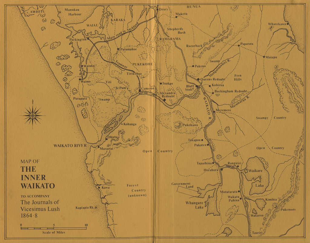 During the war years the New Zealand Government passed a Bill intended for the protection of “well disposed Inhabitants of both races”. A proposal was made for the establishment of settlers, grouped in numerous small settlements, who would be required to defend themselves and to serve wherever they might be ordered to go within New Zealand. One year later in December 1864 the Government proclaimed the acquisition of all lands taken by Her Majesty’s armed forces, and the confiscation of all Waikato country east of the Waikato River and north of the Puniu. This meant that apart from about six thousand acres near Waiuku nearly all the previously Maori-owned land was ceded to the Crown; no attempt was made to wait for the sitting of the Maori Compensation Court. By 1864 the Waikato Regiments were established on military settlements as far south as Te Awamutu, and the Government was able to give its attention to the Special Waikato Immigration Scheme.