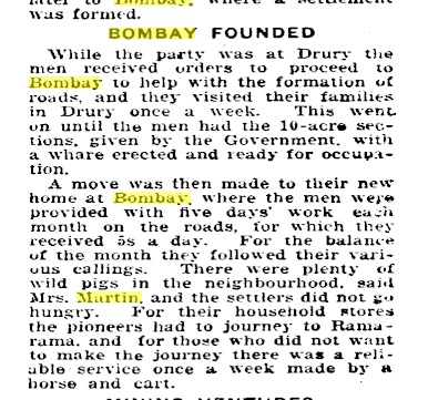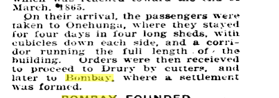 William Knowles Cornthwaite: As quoted in the New Zealand Herald on the 11th of March 1915. On our arrival in Auckland were taken to the barracks at Onehunga by Drays, and from there to Drury by boat. Some of the boats took three days to reach Drury. From Drury we went to Williamson’s Clearing by Dray. A number were lodged in the Redoubt buildings, and the married people were camped in tents on a clearing a little south of the Redoubt. The district was then dense bush with the exception of a strip a few chains wide on each side of the Great South Road, which had been fallen to facilitate the work of the troops during the war. Each male passenger of the age of 18 years and over received a free grant of 10 acres in this dense bush. The first work of the new arrivals was to fell the bush on the road lines and clear a track wide enough for dray traffic. The late Mr James Mellsop was in charge of the road works. The only settlers in the district then were the late Captain Jackson, and latter Mr R Proude, J Rutherford, Martyn and Love, and Mr Bairds caretaker Mr J Donnelly. As the district had no name except Williamson’s Clearing, a meeting of the settlers was held for the purpose of giving the settlement a name, and it was decided unanimously to call it Bombay, after the good ship which had brought us safely through storm and tempest to our destination.