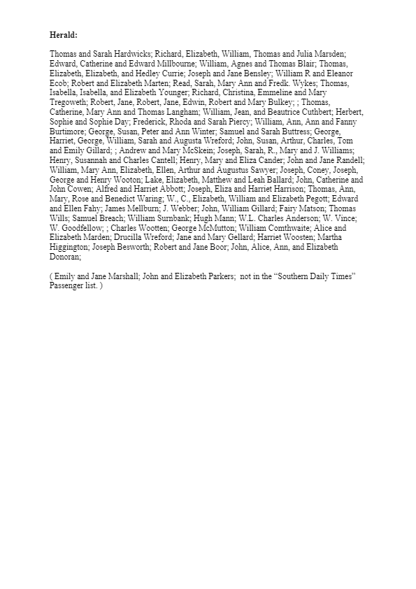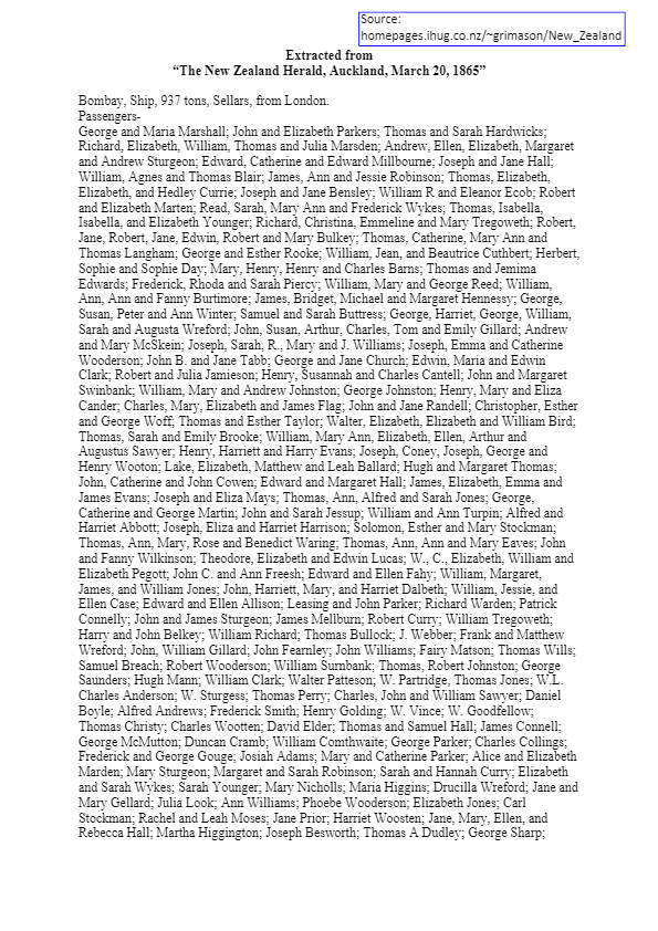Below is a record of the passengers names taken from the New Zealand on the 31st of March, 1865. The following chapters is a detailed look at who they were and what they did on arrival in the country. These people will go on to be the first women in the world to vote, with sons returning to Europe to die for the British Empire in the fields of France and Belgium, and grandsons in the sands of Egypt and in the air over London, and one grandchild will be the first to climb Mount Everest.