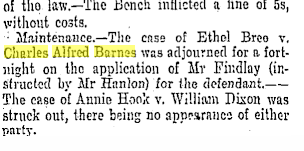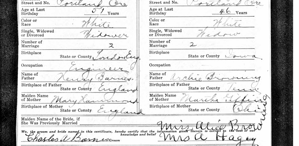 Charles Alfred Barnes. Charles was born in 1859 in England and married Ruth Wright, then later Alice Virginia Browning.