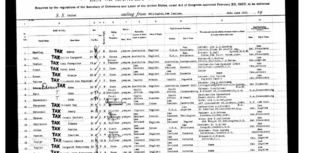 Charles was a Engine Driver and it would appear that Charles and Ethel’s marriage was not the best, as Charles travelled as a passenger on the SS Maitai on the 25th of August 1911 from Wellington to San Francisco via Rarotonga arriving on the 21st of July,1911.