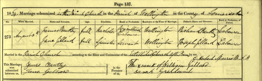 Jane Bentley (Maiden name Gillard) was aged 25 years old at the time of registering for passage on the Bombay. Jane was born in Wellington, Nynehead, Somerset, England in 1839 to Sarah Blackmore and Joseph Gillard, a agricultural labourer.