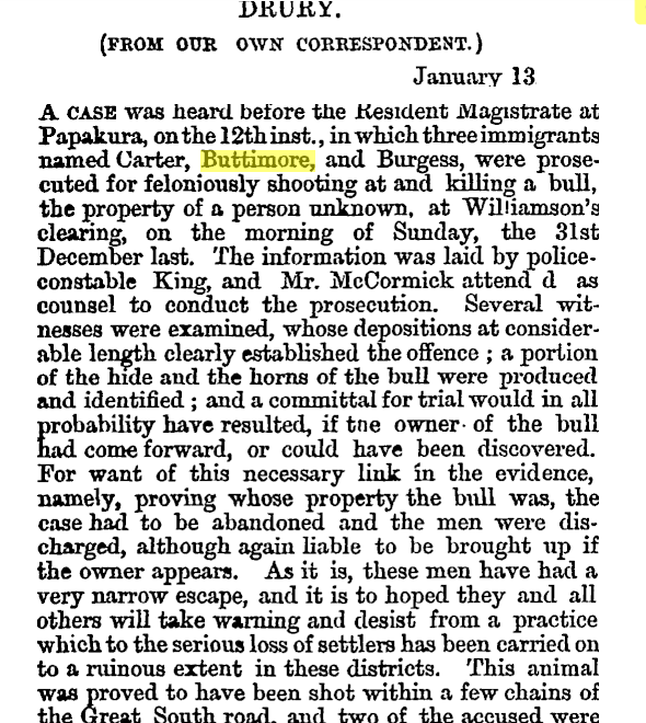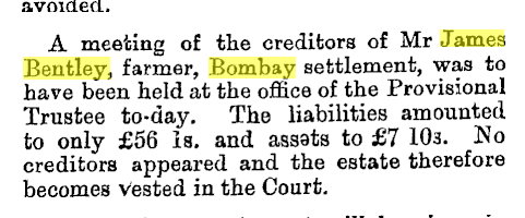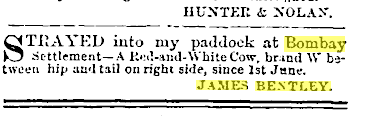 They could not afford to return to Ireland to retrieve Elizabeth, and hoped she could join them later, she later did, arriving with her uncle in 1871 onboard the ship Queen Bee. As with all the settlers in Bombay, life was hard and hunger felt often. The below extract from the Southern Cross newspaper in 1866 detailing William and several other settlers in trouble with the law over a dead cow.