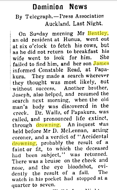 When his wife died in 1904, James remarried on 17th February,1909 to Mary Ann Johnson, however the following year James died from drowning in Hunua on 30th of October,1910. James is buried at Papakura cemetery.