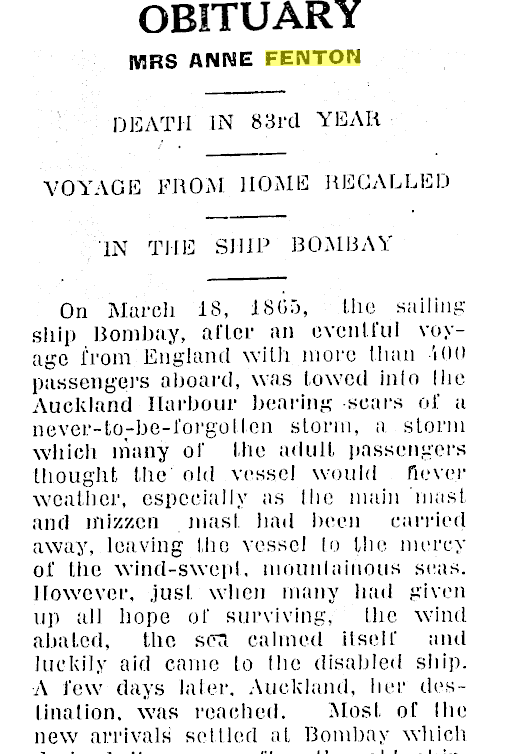 Fanny Buttimore. Fanny was born in 1863, sadly she died on the day the Bombay arrived into Auckland in 1865.