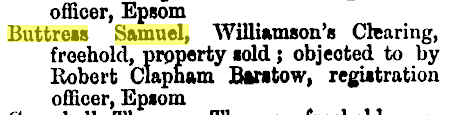 Samuel Buttress was aged 22 years old at the time of registering for passage on the Bombay Aged. Samuel and his wife did settle in Williamson Clearing, but little other information can be found.