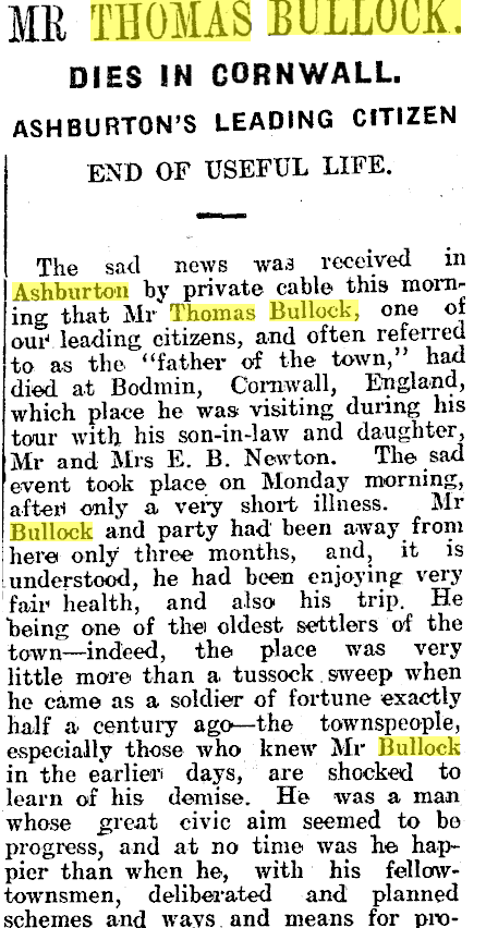 Sarah died at there home “The Willows” in Ashburton on the 14th of August, 1918. Thomas died on a return visit to Bodmin, England in 1923.