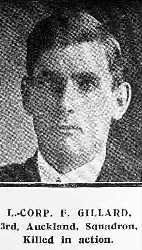 Fredrick Gillard. Fredrick was born on the 9th of August,1891. Fredrick was a volunteer in the South Auckland Cossacks’ in 1913 and served in WW1 as a Lance Corporal with the Auckland Mounted Rifles (13/60). Fredrick died on the 8th of August,1915 at Gallipoli, one day before his 24th birthday.