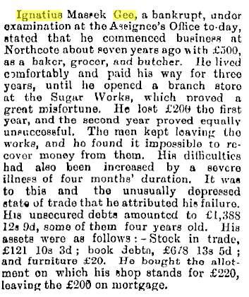 Ignatius parents were George Gee and Mary Ann Hughes, who had him baptized on the 22 November,1840. Joseph was a grocer, and his mother a baker with a shop on Church Street, Bromham near the junction with Lovers Lane.