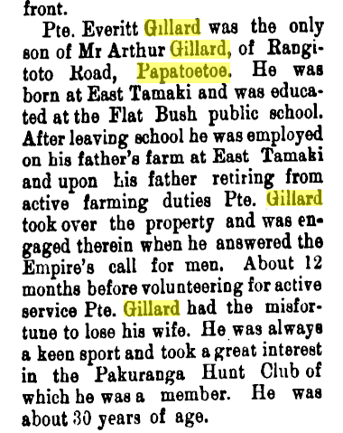 David Gillard. Davis was born on the 2nd of Febuary,1894 in East Tamaki, David also served in WW1 with the 20th Reinforcements, Auckland Infantry Battalion, A Company (30793). David survived the war and married Jane Louisa Withey on the 3rd of April,1929.