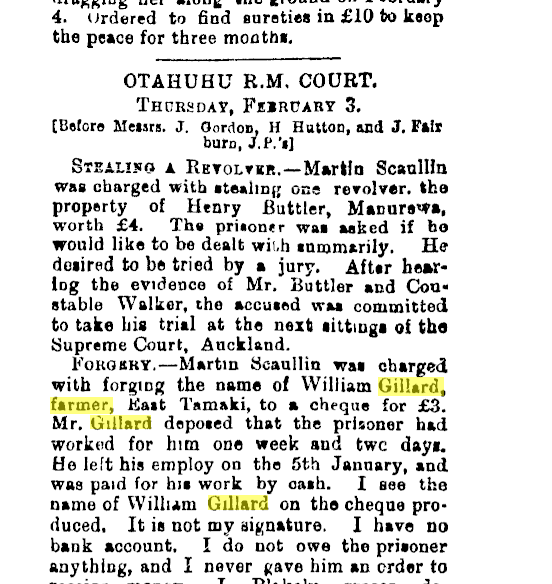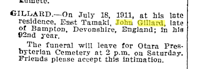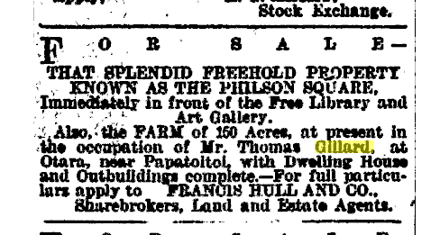 John and family settled Williamson Clearing and farmed for several years before buying a farm in the East Tamaki area of South Auckland where the family would farm on the land for over a hundred years and stretched for 400-500 acres. The farmhouse built by John in 1869 at 39 Flat Bush School Road, having only been torn down in recent times. Gillard Reserve in Botany Downs is named after the family. http://www.aucklandcity.govt.nz/council/documents/districtplanmanukau/changes/5BuiltHeritage.pdf