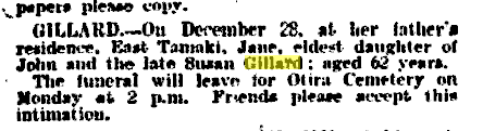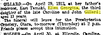 Mary Ella Gillard. Mary was born on the 31st of December,1884 in East Tamaki, but died on the 20th of Septemver,1902.