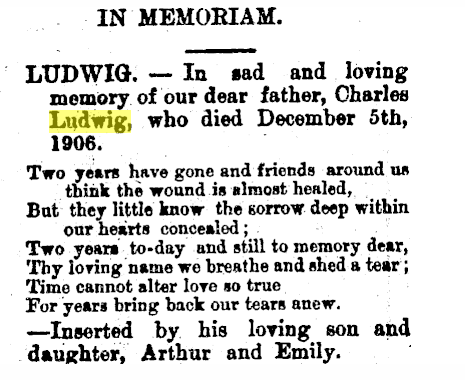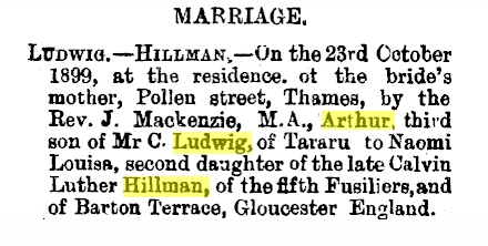 Arthur Ludwig. Arthur was born in 1877 and married Naomi Louisa Hillman on the 23rd of October,1899.