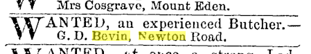 George was born in 1843 in Marton, Cheshire, England, and was the eldest son of farmer Thomas Bevin and Elizabeth Hart who worked the Hill Top Farm of 29acres. George came to New Zealand on the SS Auckland in December,1866, and worked amongst other occupations as a butcher. In July,1880 George was elected to the Karangahape District Board.