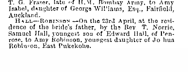 Samuel attended night school when he arrived in New Zealand and also went gold prospecting in Thames. Samuel married Amy Robinson on the 23th of April,1877 in Pukekohe and took over the Bombay farm when his father moved to Penrose, Auckland to continue working as a Cooper.