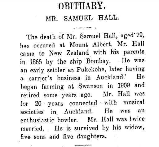 Samuel remarried to Emily Hill on the 7th of August,1895 and had further children, he died in Mount Albert, Auckland on the 21st of January,1931, his second wife lived to 1945.