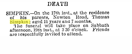 Thomas Simpkin. Thomas was born on in 1868 and died on the 17th of October,1879.