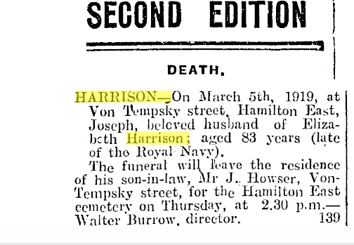 Joseph died on the 5th of March,1919, in Hamilton and is buried in Hamilton East Cemetery.