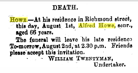 Alfred Howe. Alfred was born on the 22nd of July,1854 and married Elizabeth Ann Brown on the 16th of September,1876.