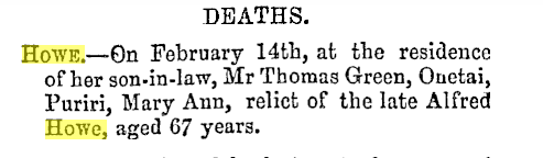 Alfred died on the 1st of August,1889 in Richmond Street, Thames and is buried with his wife at Shortland Street Cemetery.