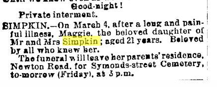 Margret Simpkin. Margret or Maggie as she was known was born in 1874 but died on the 4th of March,1896.