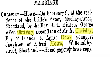 Agnes Howe was aged 11 years old at time of registering passage for the Bombay. Agnes was born on the 15th of Febuary,1852 and married George Allen Christey on the 9th of Febuary,1876 at her sisters house in MacKay Street, Thames.