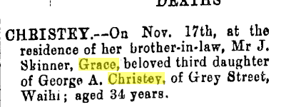 Grace Christey. Grace was born on the 29th of December,1883. Grace was thought to be deaf with balance issues and died in 1918 at Waihi.