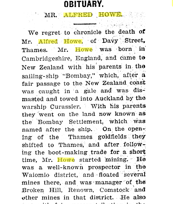 Alfred Howe was aged 9 years old at time of registering passage for the Bombay. Alfred was born on the 22nd of July,1854 in Sobham, Cambridgeshire and married Elizabeth Ann Brown on the 16th of September,1876 in Thames. Alfred had came to Thames for Mining and would become Manger to the Broken Hill Mine.