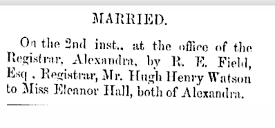 Eleanor Watson. Eleanor was born on the 16th of April,1846 in County Armagh and married Hugh Henry Watson on the 2nd of October,1867.