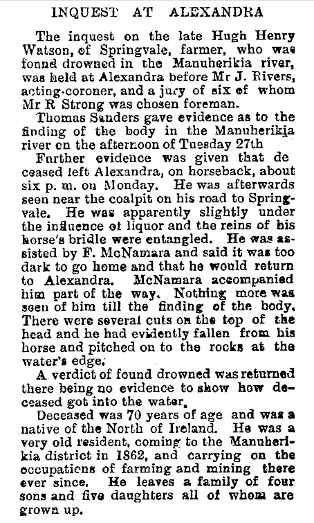 Henry drowned on the 27th of June,1905 in the Manuherikia River, and a inquest was held the following month. Eleanor lived until the 5th of Febuary,1936 in Colombo Street, Christchurch.