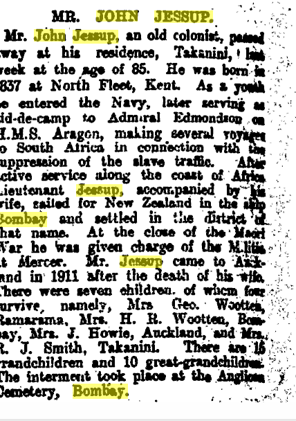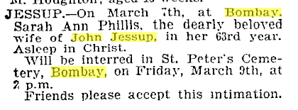 John died on the 13th of June,1922 aged 85 years old, in Auckland at the residence of his daughter Annie Smith and is buried alongside his wife at Saint Peters Church, Bombay.