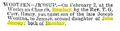Jane Wootten. Jane or Jennie as she was known was born in 1869 and married Robert Henry Wootten on the 2nd of Febuary,1893. Henry also traveled as a child on the Bombay and is the younger brother of George.