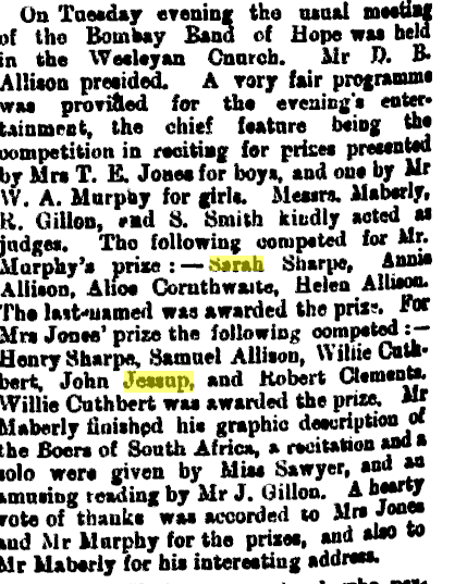A subscription was raised by the Mill workers where David was working and others totaling about £62, which was used to assist Helen and her youngest daughter back to England on the same ship Caduceus, while her two eldest children Elizabeth and Mathew remained, one finding employment with a Mr J.B Russell. Helen and Margret return on the 26th of December,1874 on the Assaye, Thomas had written to her and met her on arrival, they were soon married on the 31st of December at the home of Reverend Thomas Norrie