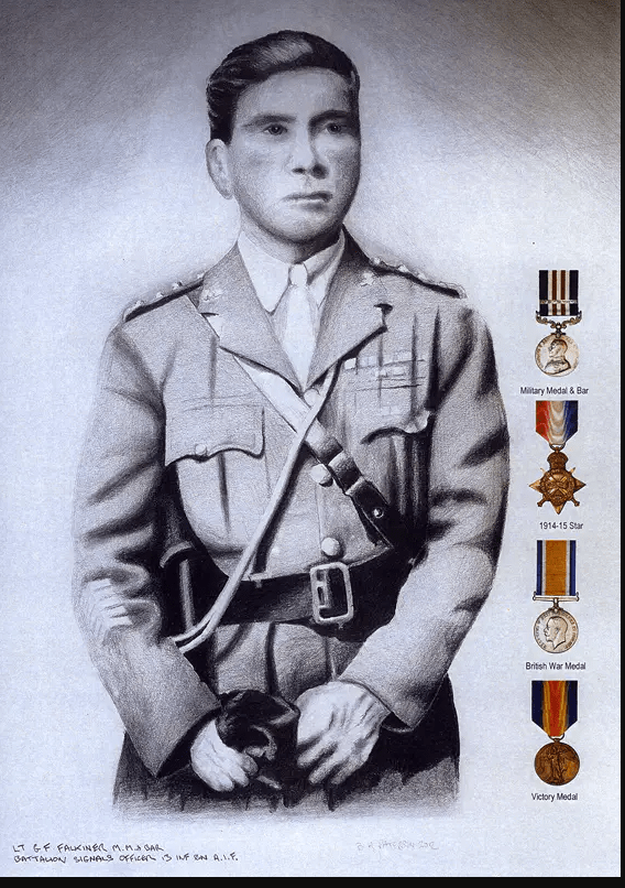 ‘On the night of 31st August,1916 in the operations north west of Pozieres, Corporal Falkiner went out to lay a telephone line. Finding the usual route impassable owing to mud and damage caused by shell fire, he went out alone and laid the wire in the open, regardless of the heavy shelling from the enemy. He successfully accomplished his work and kept his Battalion in communication at a most critical time. This N.C.O. has done consistently excellent work since the landing at ANZAC on 25th April,1915. – ‘Commonwealth Gazette’ No. 62- 19/04/1917 | Bar to Military Medal – ‘Is recommended for bravery, devotion to duty and skillful control of signal communications during operations near Zonnebeke on 26th September,1917. Though wounded before the attack commenced, he remained on duty, supervising stations, helping to run lines and doing all within his power to assure smooth working. On duty without ret or respite during the whole tour, out at all times under the heaviest barrage, he was an example and an inspiration to all. Sergeant Falkiner was awarded the Military Medal for work at Mouquet Farm on the 29th August, 1916.’ – ‘Commonwealth Gazette’ No. 66- 02/05/1918 AWMM