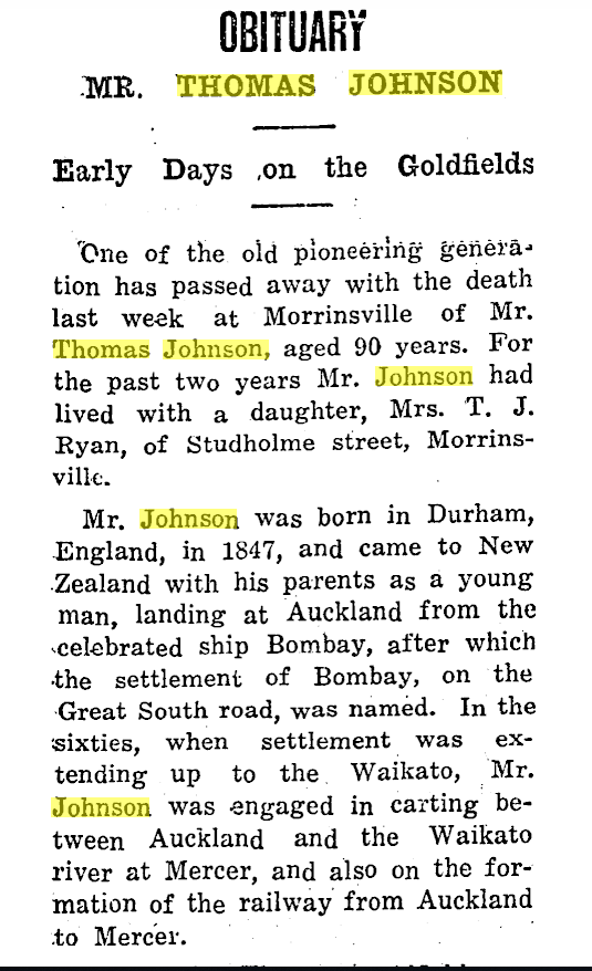 Thomas Johnson was aged 17 years old at time of registering passage for the Bombay. Thomas was born on the 27th of June,1847 in Gumerston, Durham, and like his father and brothers worked as a Coal Miner in England. In New Zealand Thomas will end up being a Engine Driver in the Mines at Waihi.