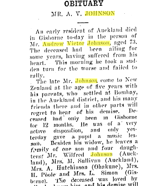 Andrew died on the 6th of August,1927 at 357 Childers Road, Gisborne and Elizabeth passed on the 21st of December,1942.