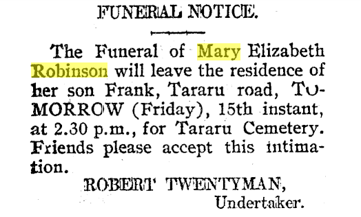 Mary married Thomas William Robinson in 1866 in Onehunga.