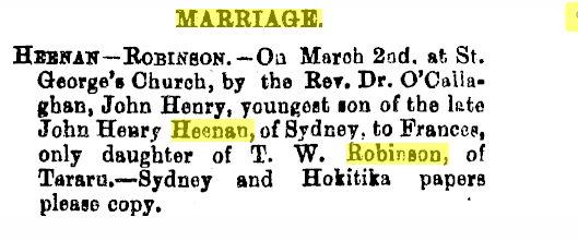 Frances Ida Heenan. Frances was born in 1871 and married John Henry Heenan on the 3rd of April,1890.