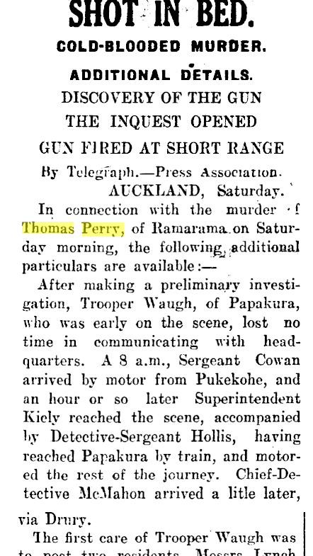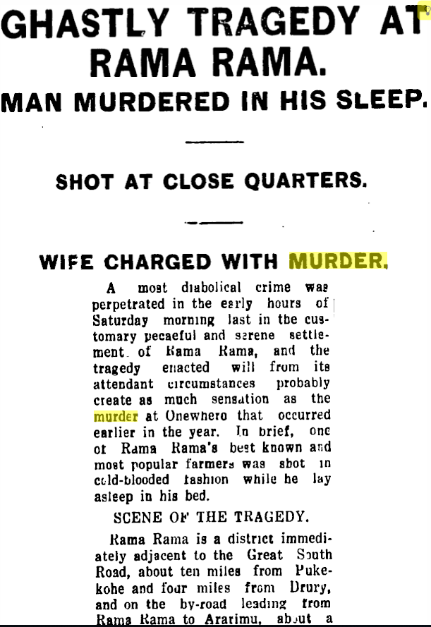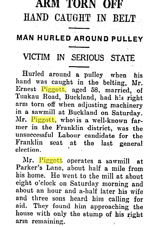 John had a finger amputated after it was smashed in a cuff-chatting machine in 1894 and was murdered in his sleep at home in Ramarama on the 25th of September,1915. His wife was accused of the murder, but not convicted.