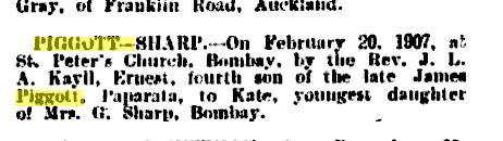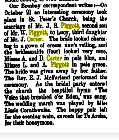 James Solomon Piggott. James was born in 1866 and married Lucy Carter on the 21st of October,1896. Lucy is the daughter of Jacob Carter and Rebecca Turner, who came on the ship Durham in 1873, Jacob is the brother of Bombay passenger Henry Carter.