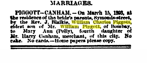 Catherine Ann Piggott. Catherine was born on the 1st of October, 1851 and married James George Piggott in 1869. James in the younger brother of Bombay passenger William Charles Piggott.
