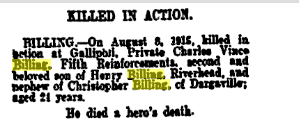 Sarah Jane Billing. Sarah was born on the 21st of May,1868 and married Henry Billing in 1888, however Sarah died on the 26th of August,1891 aged just 23, leaving her new born baby and infant child to be raised by her parents Jane and William. The new born named Charles grew up to serve in WW1 (12/2212) but was killed at Gallipoli.