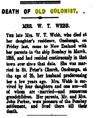 William’s brother James also travelled to New Zealand and also settled in Bombay and married fellow Bombay passenger Catherine Ann Parker.