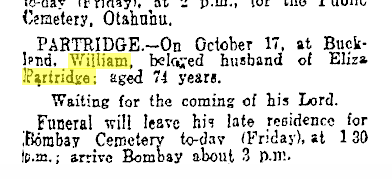 William Partridge was aged 19 years old at time of registering passage for the Bombay. William was born in 1845 in Devonshire, England. William was a farmer and came as a recipient of the Waikato Immigration Scheme, and was allocated ten acres. William subsequently purchased 116 acres of virgin bush in Paparata and cultivated it as a dairy farm.