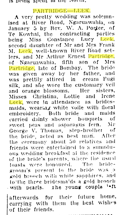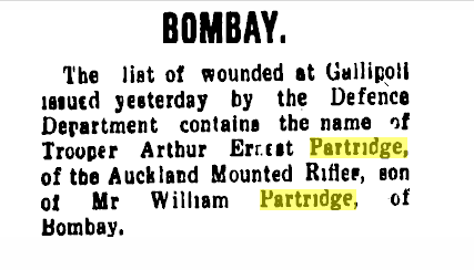 Arthur Ernest Partridge. Arthur was born on the 28th of October 1892. Arthur served in WW1 with the 4th Reinforcements, Auckland Mounted Rifles (13/937) and was wounded at Gallipoli. Arthur married Constance Lucy Leek on the 5th of January,1921.