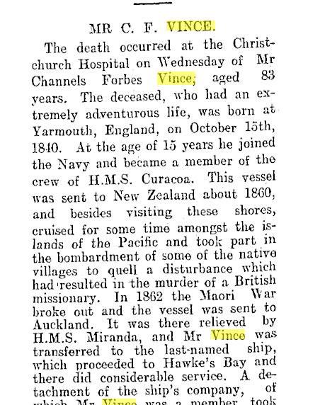 After Fredrick died Rhoda married Charles Forbes Vince in Auckland on the 5th of May,1869. Charles was born in Yarmouth, Hampshire and had joined the Royal Navy at the age of 15, by coincidence Charles served on HMS Curacoa the ship that rescued the Bombay, but had transferred some years early to HMS Miranda during the Waikato War, Charles took part in land conflicts in the Waikato and at Gate Pa.