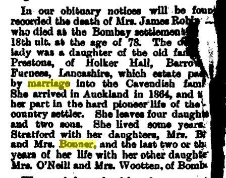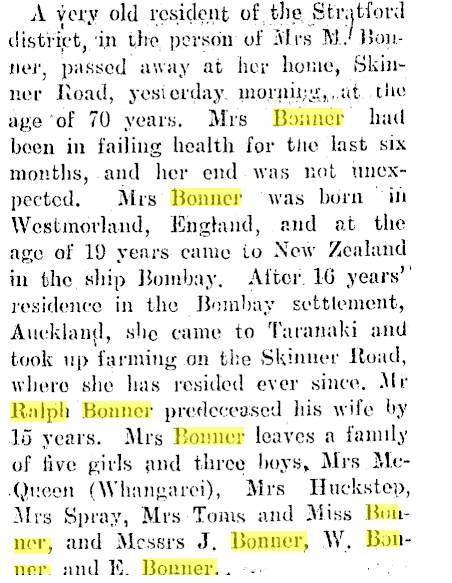 Margret married Ralph Bonner on the 20th of May,1866 in Bombay, Ralph with Margret’s father and her sisters husband Thomas O’Neil would travel to Thames in the 1870’s and try there luck during the gold rush, but eventually Ralph and Margret will move down to Taranaki.