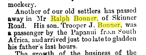 William Ralph Bonner. William was born in 1872 and served in the Boer War (788) with the NZ Mounted Rifles, 3rd Contingent. William married Mary Josephine Mears on the 8th of October,1902.