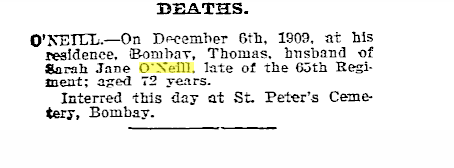 Sarah’s father William owed a considerable debt to Thomas O’Neil, which was agreed to be cancelled upon marriage to Sarah. Sarah and Thomas married on the 4th of August,1869 in Bombay.